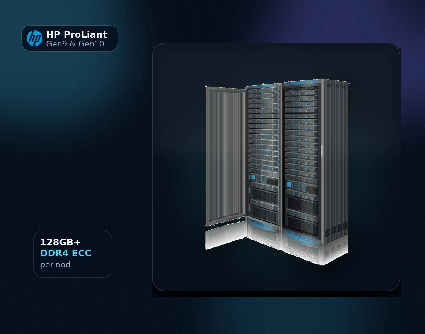 Platforma este construită pe servere HP ProLiant Gen9 / Gen10, procesoare Intel Xeon E5-2650 v4, minimum 128GB RAM DDR4 ECC pe nod și SSD-uri SAS Enterprise în RAID 10, pentru un nivel ridicat de continuitate și performanță.